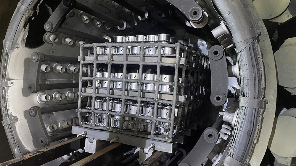 加熱室(爐膽)由隔熱層、加熱元件、石墨噴管和料臺等組成。隔熱層為三層石墨軟氈(20mm)和一層石墨硬氈(30mm)組成的圓形結構。其結構保溫性能好,硬氈特點:在氣淬時不會被強風吹掉保溫層,大大的提高了加熱室的使用壽命。隔熱層被固定在由不銹鋼板網和角鋼圈組成的加室框架上;前、后蓋裝有固定風門,風門邊上包有CFC材料防止氣流沖刷。 加熱元件采用石墨管,用陶瓷件絕緣。加熱元件沿隔熱層內壁圓周方向均勻布置,加熱均勻、熱損失小;可單獨拆卸,且更換方便。石墨噴管為多列石墨噴管,均勻的沿隔熱層內壁圓周方向分布在加熱室里。在氣淬時強制氣體均勻的從石墨噴管噴出,有效的達到均勻淬火。料臺由石墨支柱、石墨爐床和爐床上的Si2O3隔條組成。此結構可防止高溫時料盤和石墨爐床的粘結。加熱溫區分為1區。1溫區獨立加熱,1溫區獨立控溫。整個圓形加熱室沿爐體長度方向劃分為一個環形單元。絕緣子采用高純氧化鋁絕緣瓷件,具備高溫絕緣。